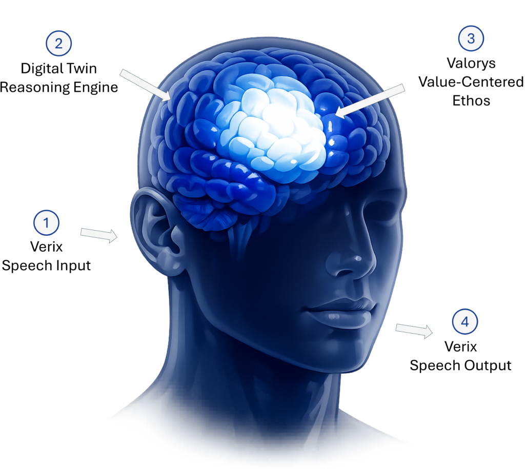 When a leader engages Verix with a challenge, the agent is not performing a database search or generating a generic response from its training data. It is reasoning from the organization’s own context—the knowledge repository that has been built into the digital twin—and interpreting that context through the Valorys value framework.